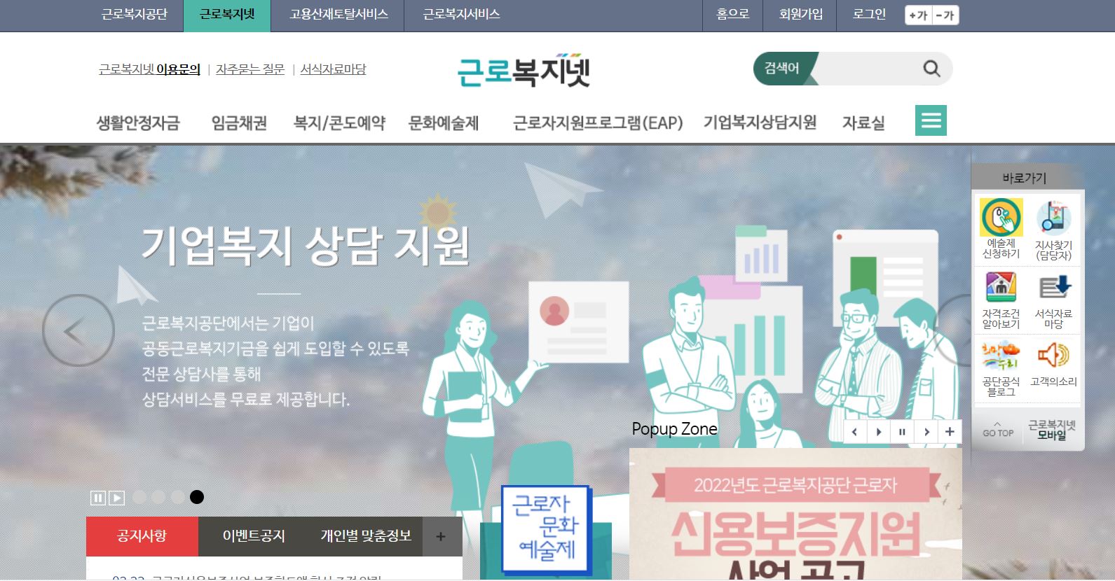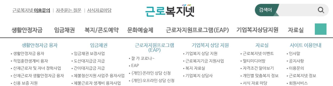근로복지넷 홈페이지에 가면 다음과 같이 생활안정, 기업복지 등 복지에 대한 정보가 있습니다.