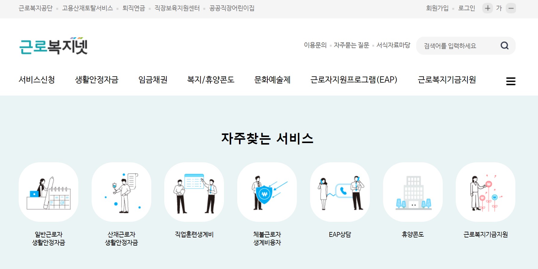 근로복지넷은 근로복지공단에서 운영하는 홈페이지로 각종 근로자 복지사업을 신청할 수 있는 사이트입니다.