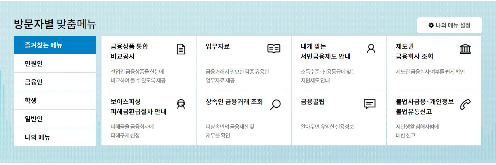 또한 많은 분들이 금융감독원 홈페이지에 방문하는데 그 중에는 민원인. 금융인. 학생. 일반인 등 다양합니다. 홈페이지 첫 화면에서 방문 목적에 따라 맞춤 메뉴를 볼 수 있어 쉽게 이용이 가능합니다.