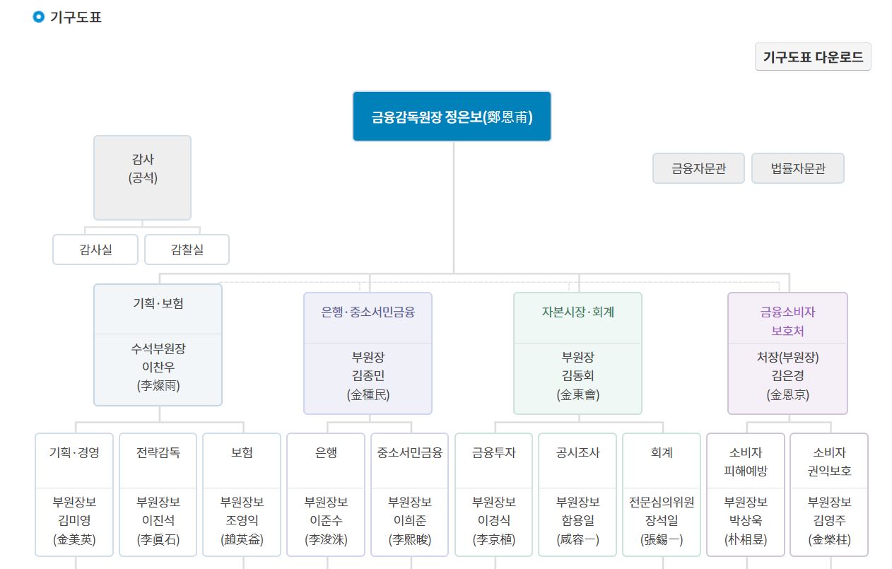금융감독원의 흐름과 조직을 이해하려면 조직도를 보는게 좋습니다. 조직도는 금융감독원장을 시작으로 여러 부 서로 나뉘며 또 해당부서들이 하위부서로 나뉩니다. 금융감독원 조직도 바로가기