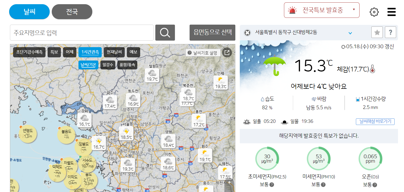 궁금한 지역을 검색하면 기상정보가 자세하게 나옵니다. 강원도 강릉시를 검색했더니 현시간 기준으로 날씨정보가 나옵니다.