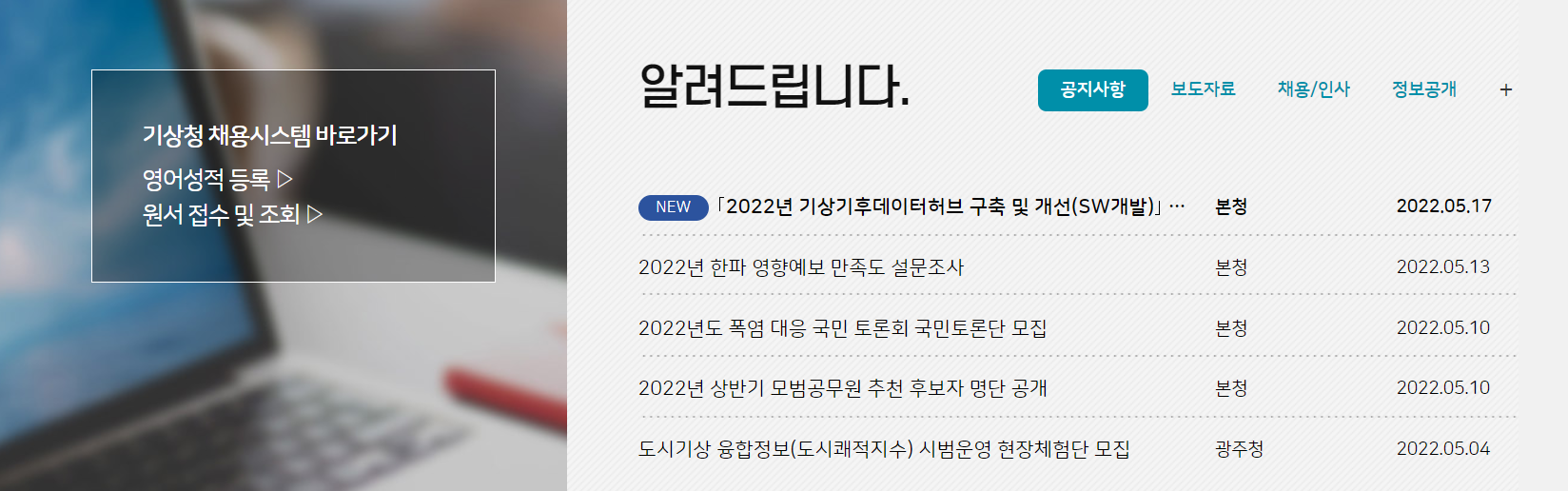 기상청 채용정보가 궁금한 분들도 홈페이지에서 확인할 수 있으니 아래 홈페이지 링크를 통해 자세한 내용을 알아보시면 도움이 될 것입니다.