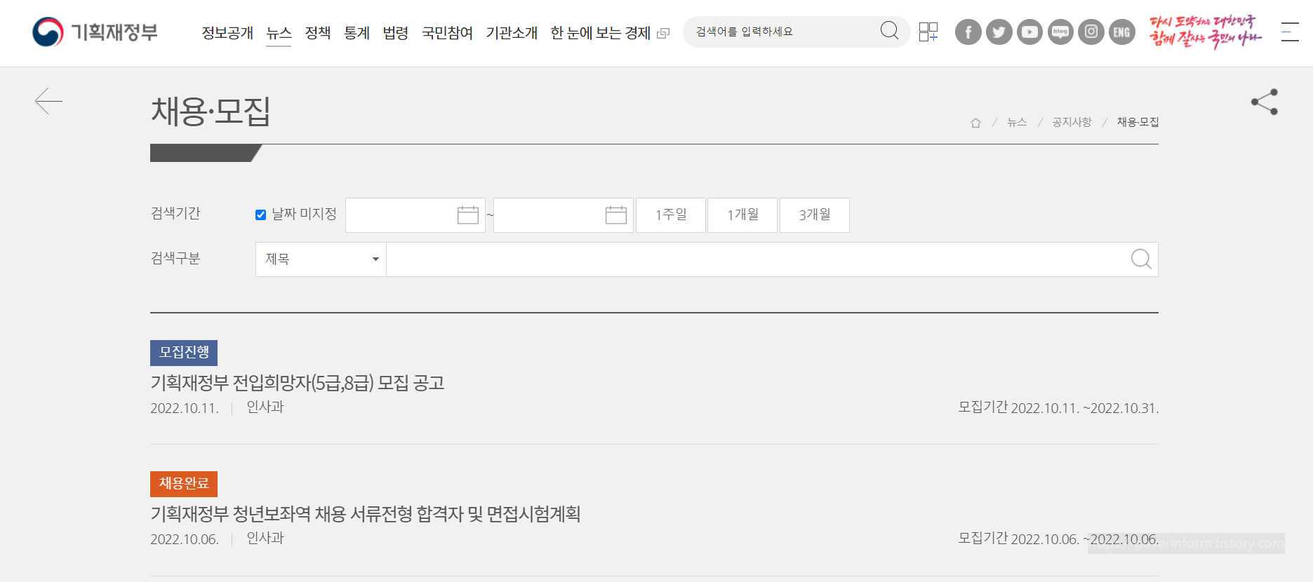 기획재정부 채용공고도 많은분들이 궁금해하는 분야인데 기획재정부 홈페이지에 채용공고가 나와있습니다.