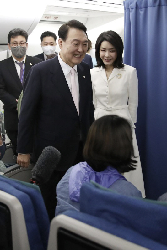 스페인 나토회의참석을 위해 탑승한 비행기에서의 모습입니다. 그냥 깔끔한 정장차림입니다. 10시간이 넘는 비행에서 저런 정장차림으로 내내 비행기에 있었을것같진 않고 사진촬영을 예상하고 정장으로 입었을것입니다. 비행기안에서는 편한 옷이 최고지요 ㅎㅎㅎ