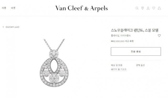 금액대로 논란을 일으키고 있는데 목걸이인데요 이는 반 클리프 앤 아펠 펜던트 제품입니다. 눈꽃 결정체 형태에 착안하여 디자인 되었으며 온라인 카탈로그 상에서 이 목걸이의 가격은 6200만원 입니다. 소재에 따라 금액이 달라지는데 라지 모델은 1억원이 넘는다고 합니다.