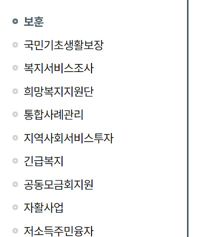 보훈, 국민기초생활보장, 희망복지지원단, 긴급복지, 저소득주민융자, 노인복지 등 다양한 복지 서비스가 있으니 홈페이지에서 확인 바랍니다.