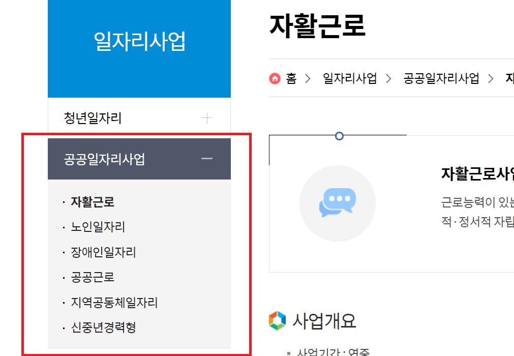 김포시통합일자리정보 홈페이지-일자리사업-공공일자리사업 선택 시 자활근로/노인일자리/공공근로/지역공동체일자리/신중년경력형 일자리 소식을 볼 수 있습니다.