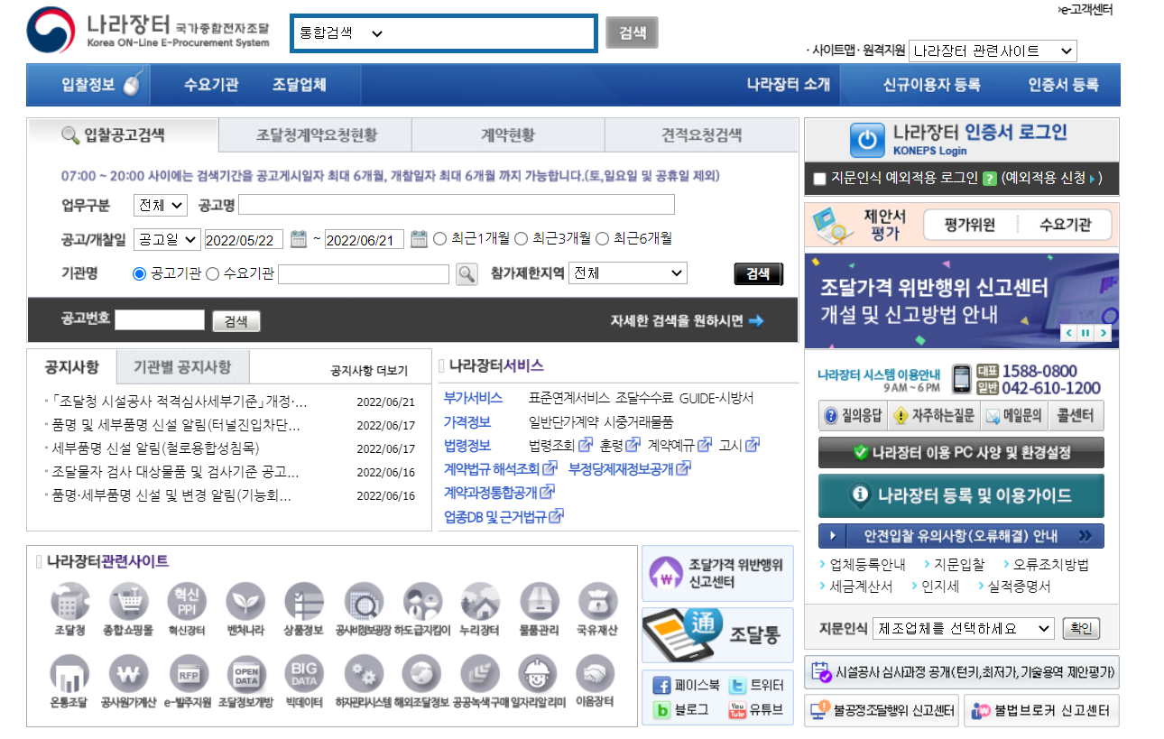 나라장터는 조달청에서 운영하는 국가종합전자조달시스템입니다. 원래는 수작업이나 서류작업으로 조달업무를 했는데 디지털화되면서 조달청도 조달업무를 나라장터 홈페이지에서 하기로 했습니다.