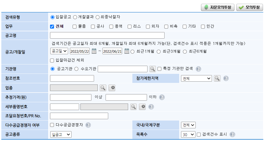 입찰공고 검색뿐만 아니라 조달청계약요청현황 계약현황 견적요청검색도 할 수 있으니 필요하신 분은 나라장터 홈페이지를 확인하시기 바랍니다.