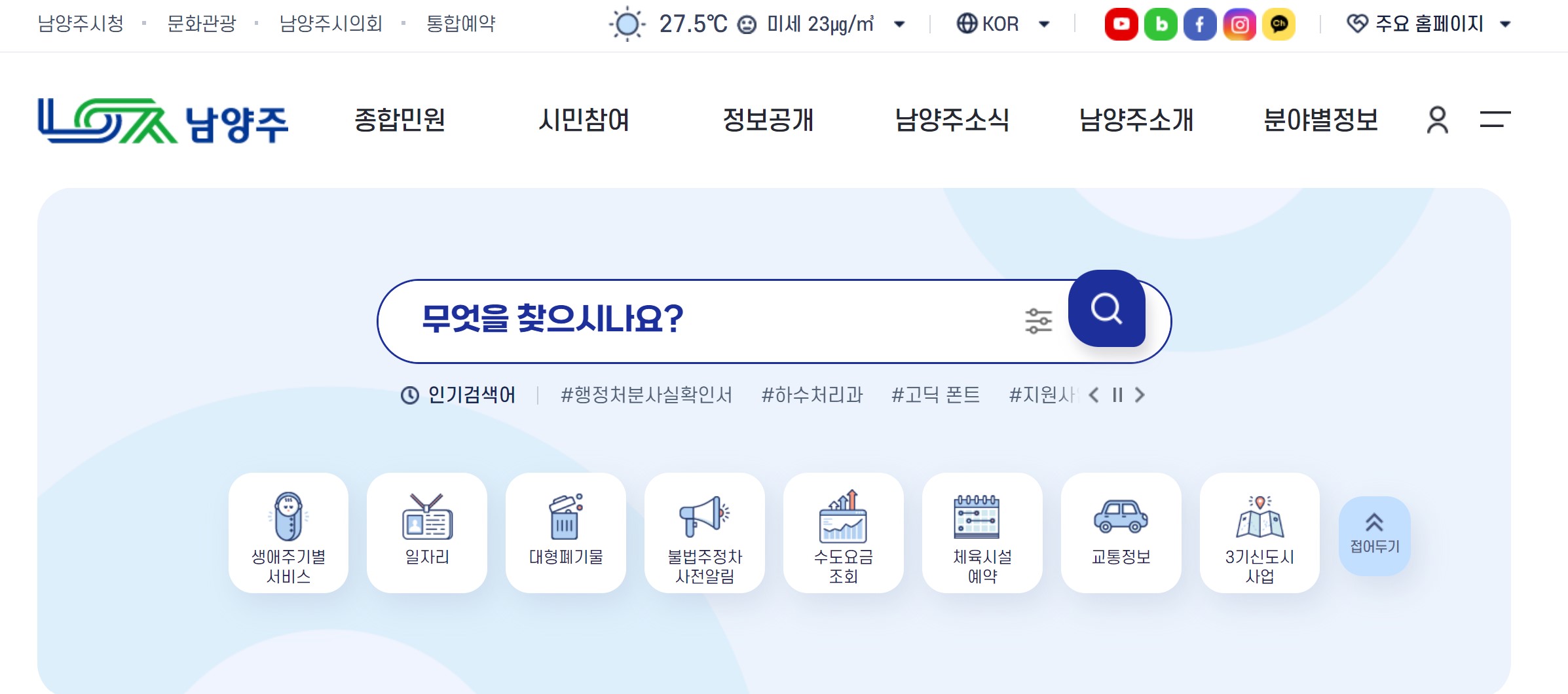 남양주시청 홈페이지 메인화면, 첫화면입니다. 랜딩페이지라고도 불러요. 종합민원, 시민참여, 정보공개, 남양주소식, 남양주소개, 분야별정보가 있습니다.