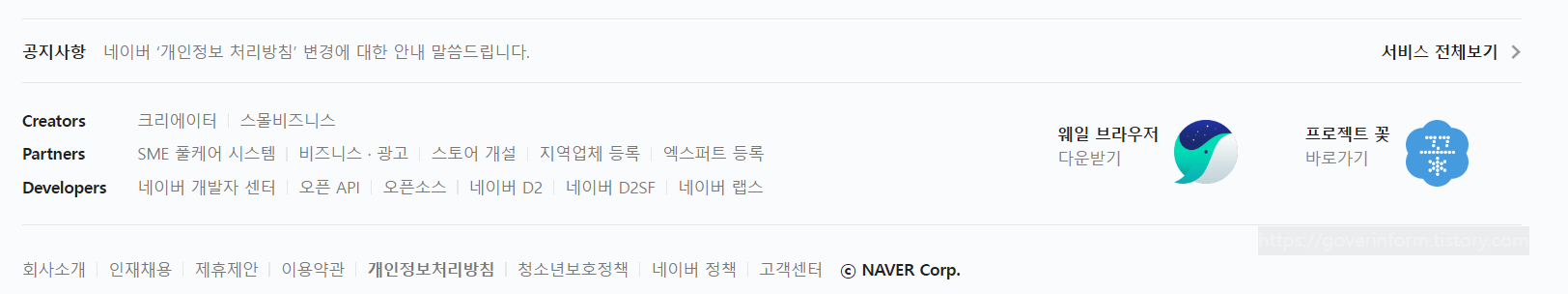 네이버 홈페이지 첫화면 하단에 보면 "서비스 전체보기" 혹은 "고객센터" 문구가 보이면 클릭합니다. 고객센터를 클릭하면 바로 고객센터 홈페이지로 넘어갑니다.