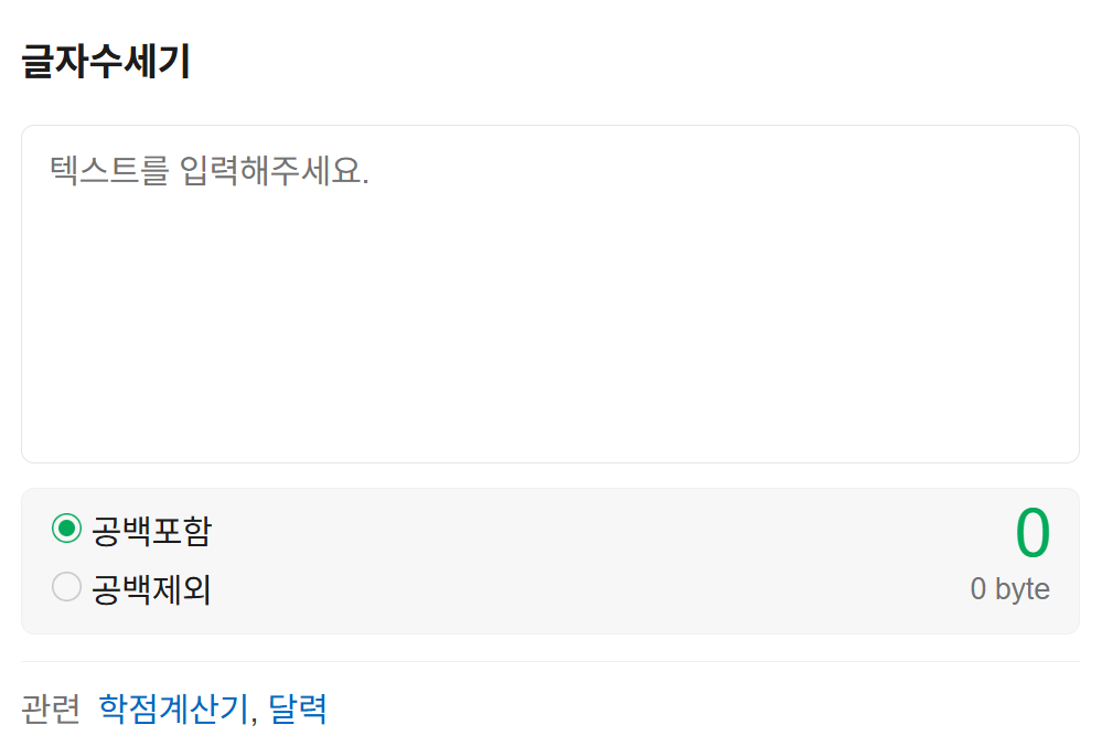 - 네이버에'글자 수 세기' 또는 '네이버 글자 수 세기' 입력 후 보이는 화면처럼 글자 수 세기 프로그램을 이용할 수 있습니다. 아래 링크도 있으니 편한 방법으로 이용하세요.
