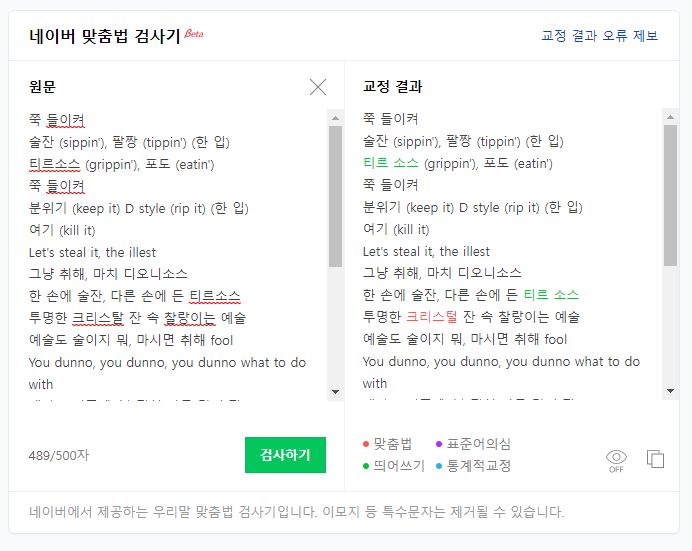 왼쪽 창 원문이라고 되어 있는 곳에 맞춤법 검사를 원하는 단어, 문장을 입력하고 검사하기를 터치합니다. 아래 보이는 검색결과처럼 우측에 교정 결과가 나오고 맞춤법뿐만 아니라 표준어 의심, 띄어쓰기, 통계적 교정도 나옵니다. (빨강-맞춤법, 보라-표준어의심, 녹색-띄어쓰기, 파랑-통계적 교정)