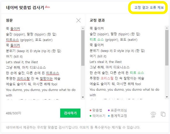 이용 중 교정 결과 요류가 있는 경우에는 오류를 제보하여 교정 결과에 반영되도록 할 수 있습니다. 교정 결과 창의 우측에 보면 교정 결과 오류 제보가 표시되어 있는 부분을 터치하면 됩니다.
