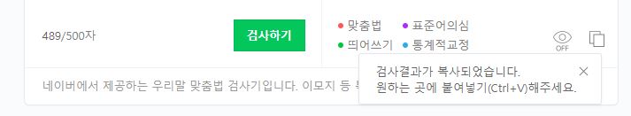 원문 입력창에는 500자까지 입력이 가능하고, 500자를 초과하는 경우 원문을 분할하여 500자 단위로 검사하기를 하면 글자수 제한 없이 이용할 수 있습니다. 또한 이모지나 이모티콘 특수문자는 교정 결과에서 제거되어 표시되지 않을 수 있습니다. 원문을 검사하기 한 후 교정 결과를 복사하기 하여 원하는 곳에 붙여 넣기 할 수 있으며 복사+붙여 넣기 기능은 교정 결과의 하단에 아이콘을 터치하면 복사 기능 이용이 가능합니다. 원하는 곳에 붙여 넣기(Ctrl+V)하면 됩니다.