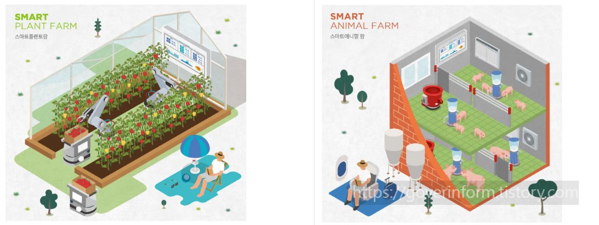 농림축산식품부 스마트팜은 비닐하우스, 유리온실, 축사에 IoT나 빅데이터 인공지능 로봇과 같은 4차 산업혁명 기술을 접목시킨 농장으로 원격제어, 뎅이터 기반 정밀 생육관리, 인공지능 무인자동화 이렇게 세 단계로 구분합니다. 스마트온실은 누구나 편리하게 고품질 농산물을 생산하는 고생산성 온실이며 스마트 축사는 깨끗하고 안전한 환경에서 편리하게 가축을 기르는 지능화 자동화된 축사입니다.