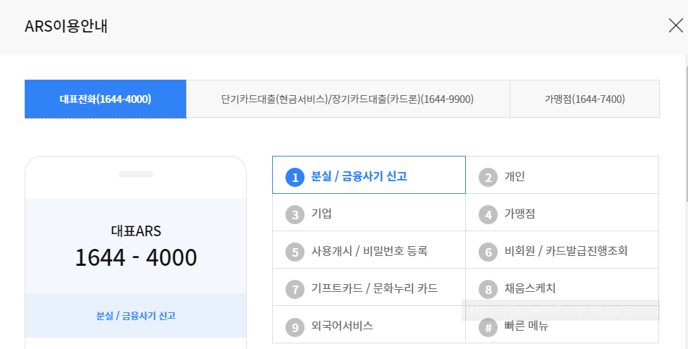 대표번호는 1544-4000 이며, 단축번호는 아래와 같습니다.