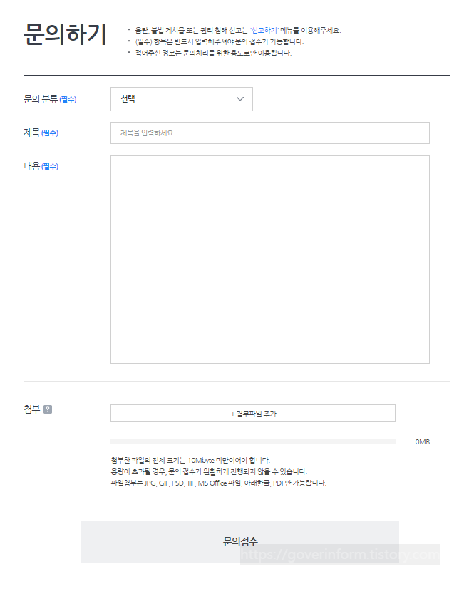 다음은 문의하기 게시판입니다. 문의 분류, 제목, 내용을 입력하고 필요한 경우 첨부파일을 추가한 다음 문의접수를 합니다.