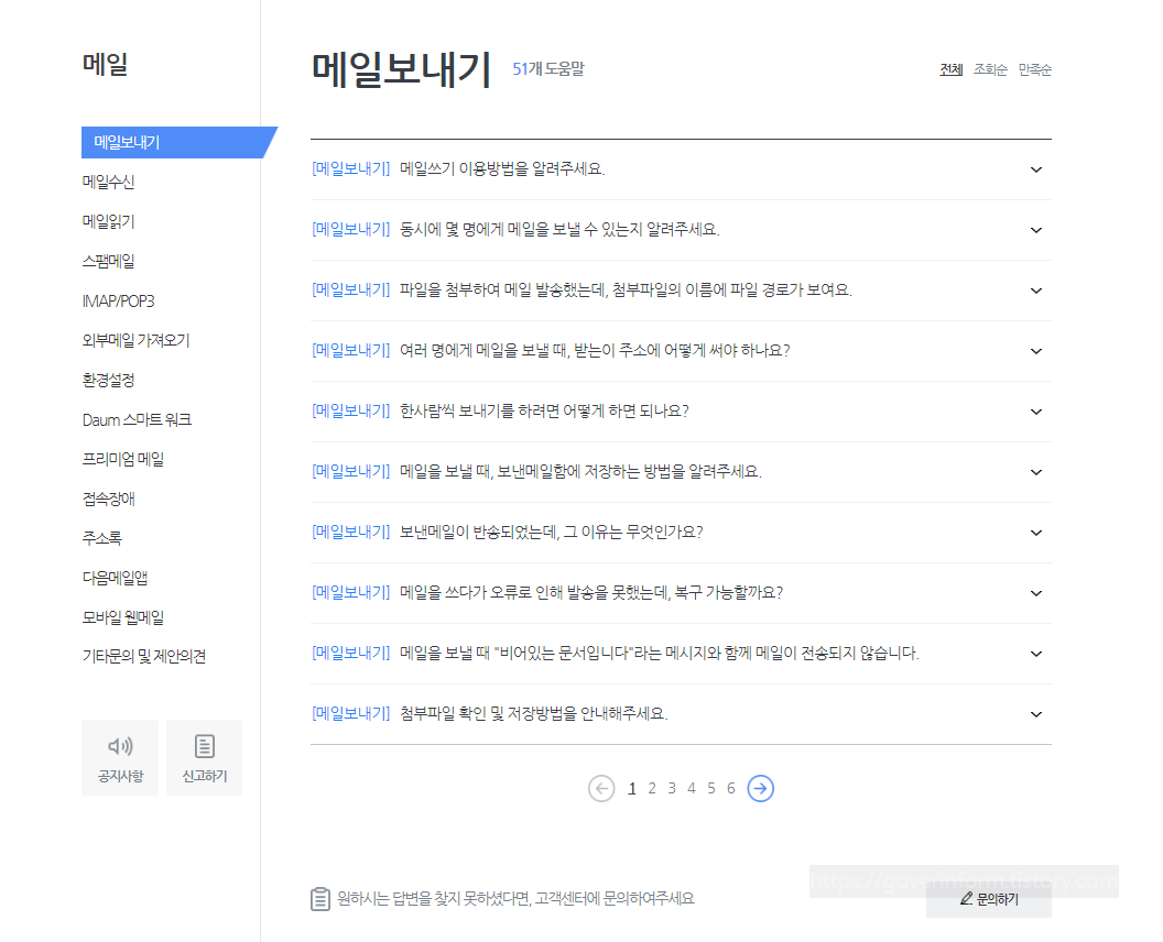 예를들어 메일 카테고리에 접속해보겠습니다. 다음처럼 여러개의 문의가 있고 문의사항을 클릭하면 답변이 나옵니다. 만약 내가 원하는 문의사항과 답변이 없는경우 하단의 "문의하기"를 클릭하면됩니다.