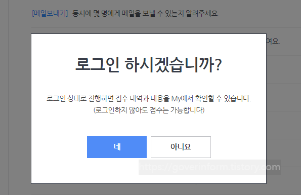 로그인 권유창이 뜹니다. 로그인하면 My에서 접수내역 내용을 확인해볼수 있으나 로그인이 필수사항은 아닙니다. 로그인 하지 않아도 문의할수있습니다.