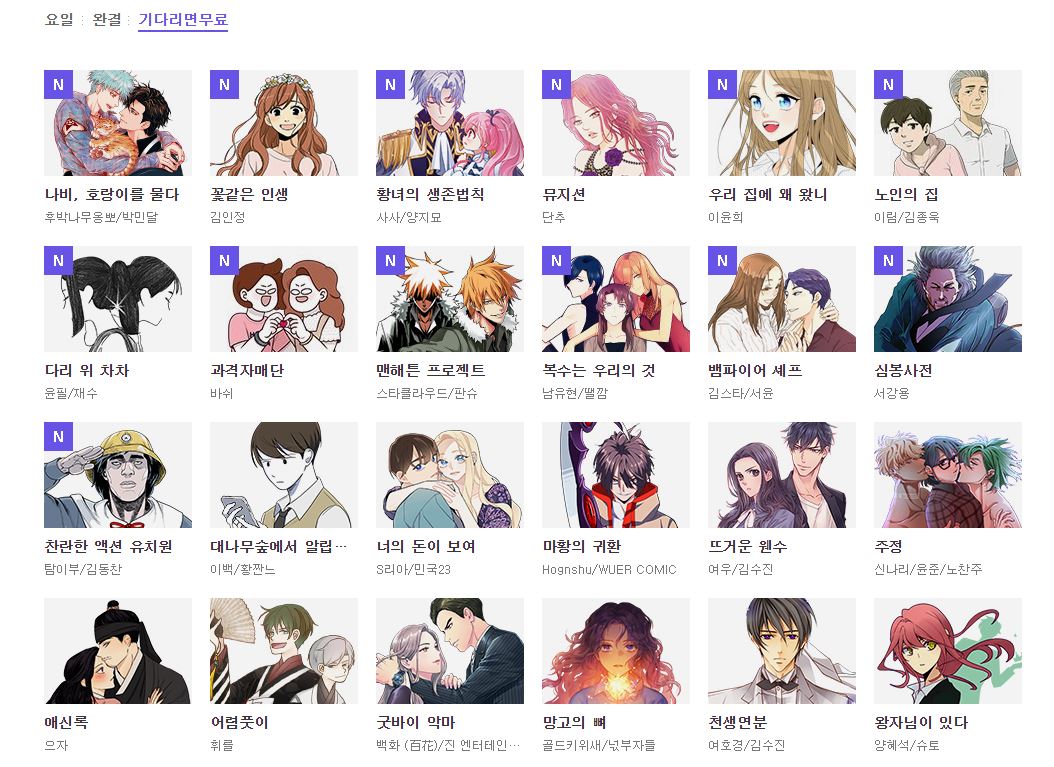 다음 웹툰에서 볼 수 있는 웹툰들을 한 눈에 볼 수 있으며 완결된 시리즈와 기다리면 볼 수 있는 웹툰까지 정리가 되어있습니다.