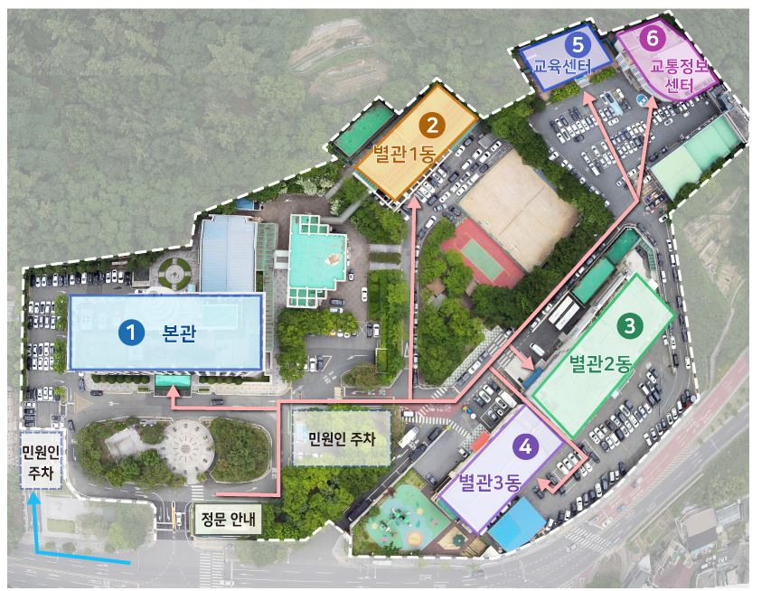 대구경찰청사는 다음과 같이 배치가 되어있으며 본관, 별관1,2,3동, 경찰교육센터, 교통정보센터 등으로 이루어져 있습니다. 대구경찰청 방문을 원하는 분은 대구경찰청(건너) 정류장 버스 이용이 가능하며 204,403,449,814번이 운행 중이며 도시철도는 3호선 지산역 1번 출구와 가까우며 도보 10분이 소요되오며 방문객은 정문 안내소를 먼저 방문해야 하오니 참고하시기 바랍니다.