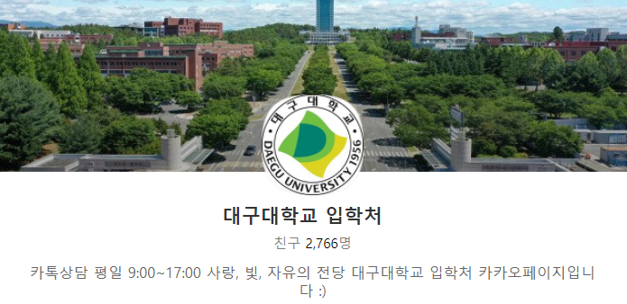 요즘 코로나로 인해 입학설명회가 축소되면서 많은 대학이 대학별 카톡상담서비스를 운영하는데 대구대학교 입학처에서도 카톡상담을 운영중입니다.
