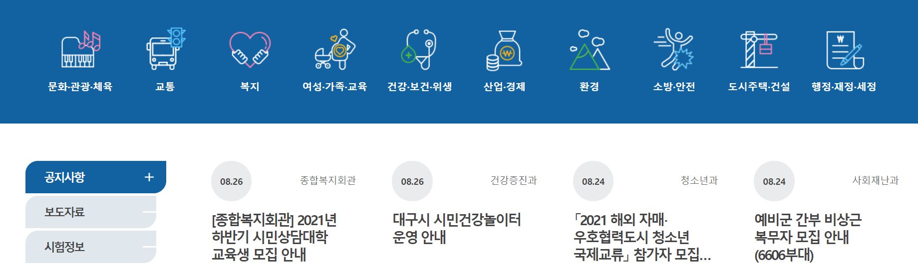 대구시청 홈페이지에서는 대구시 채용정보 복지정보 조직도 새소식을 볼 수 있으니 필요한 분은 홈페이지에서 확인하면 도움이 될것입니다.
