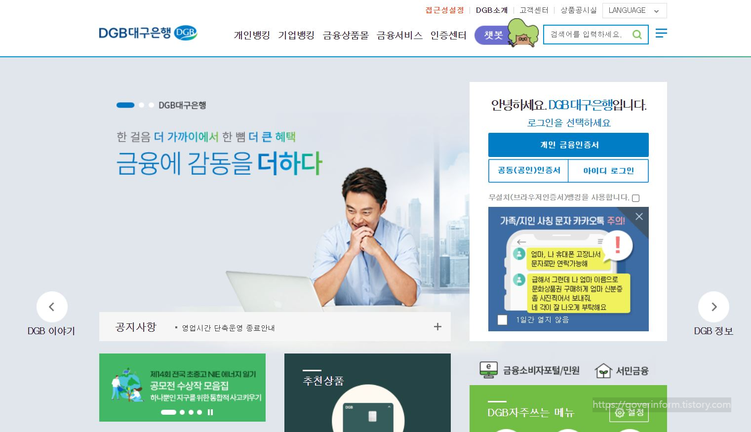구글 검색창에 대구은행이라고 입력하면 대구은행 홈페이지 url(https://www.dgb.co.kr/dgb_ebz_main.jsp)이 있다. 이곳에 접근하면 하단처럼 대구은행 홈페이지를 볼 수 있다. 대구은행 홈페이지에는 개인뱅킹, 기업뱅킹, 금융서비스, 인증센터 서비스 이용이 가능하다.