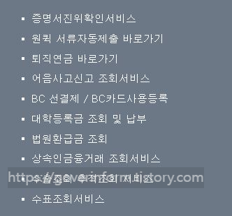 그 외에도 증명서진위확인서비스, 서류자동제출, 퇴직연금 조회, 어음사고신고 조회, BC 선결제, BC카드사용등록, 대학등록금납부, 법원환급금 조회, 상속인금융거래, 수출조회 추적조회, 수표조회 서비스도 이용 가능하다.