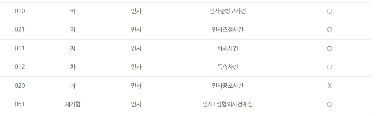 민사 신청 진행 비송 도산 형사 보호 가사 행정 특허 선거 특별 감치 가족관계등록 공탁에 따른 코드와 사건구분 사건유형 내용에 대한 사항은 아래 사건구분안내 대국민서비스 바로가기에서 이용할 수 있습니다.