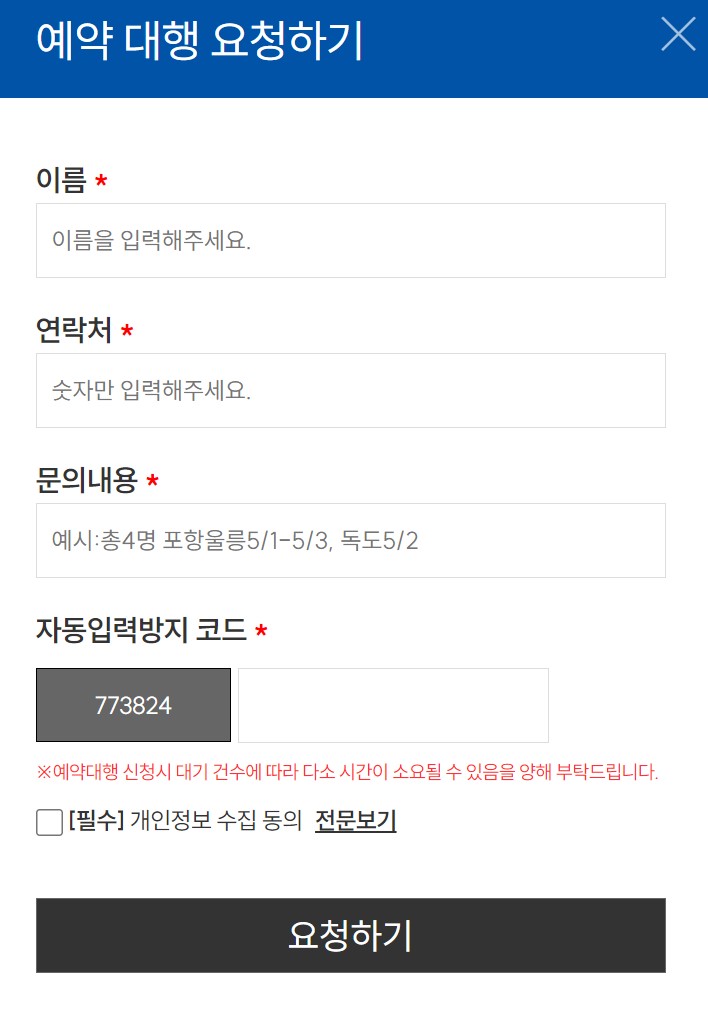 2) 이름/연락처/문의내용을 입력하고 요청하기를 하면 상담사가 연락을 드려 예약대행 진행을 도와드립니다.