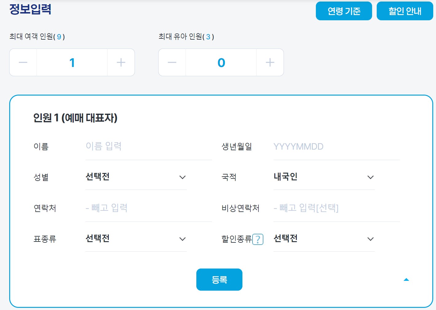 4) 일정을 확인하고 인원에 맞게 이름/생년월일 등의 인적사항을 작성합니다.