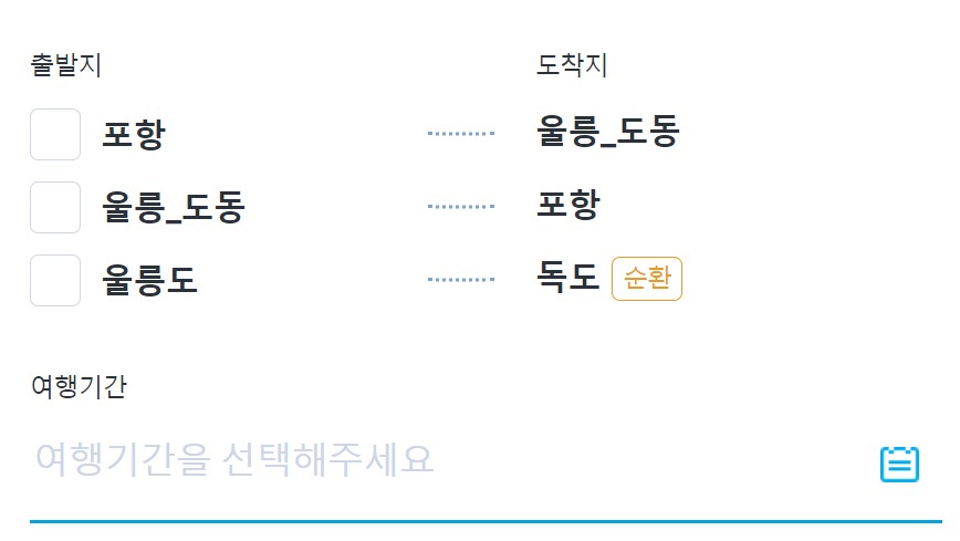 2) 출발지/도착지를 선택하고 여행기간을 선택합니다.
