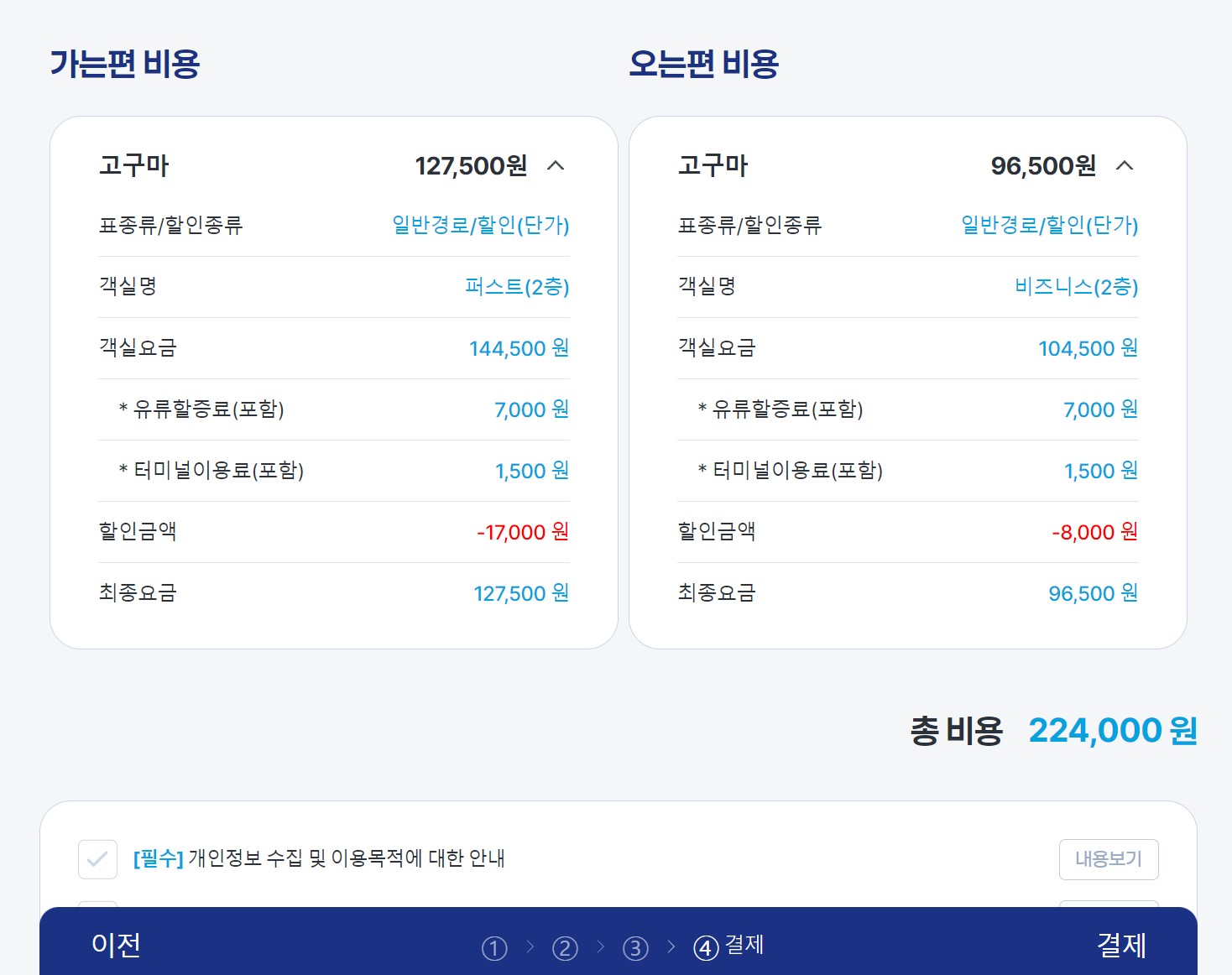 5) 가는편/오는편의 비용을 확인하고 결제를 하면 예매가 완료됩니다.