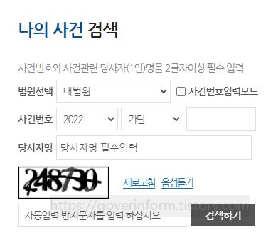홈페이지 첫화면 우측 하단에는 나의 사건 검색이 있다. 법원을 선택하고 사건번호 그리고 당사자명을 입력하면 나의 사건 진행사항을 열람할수 있다.