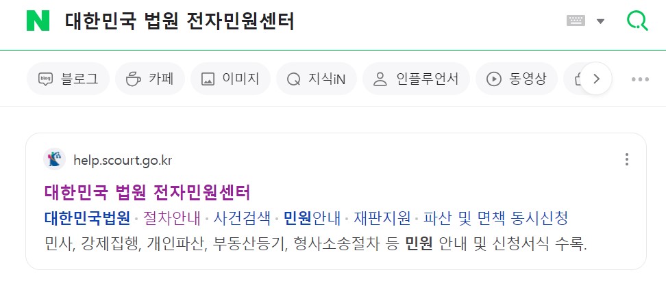 네이버, 다음 등 평소 이용하는 홈페이지 검색창에 ' 대한민국법원 전자민원센터 '를 입력하고 검색을 하면 홈페이지가 나옵니다. 아래 url을 터치해도 되고 편한 방법으로 이용하세요.