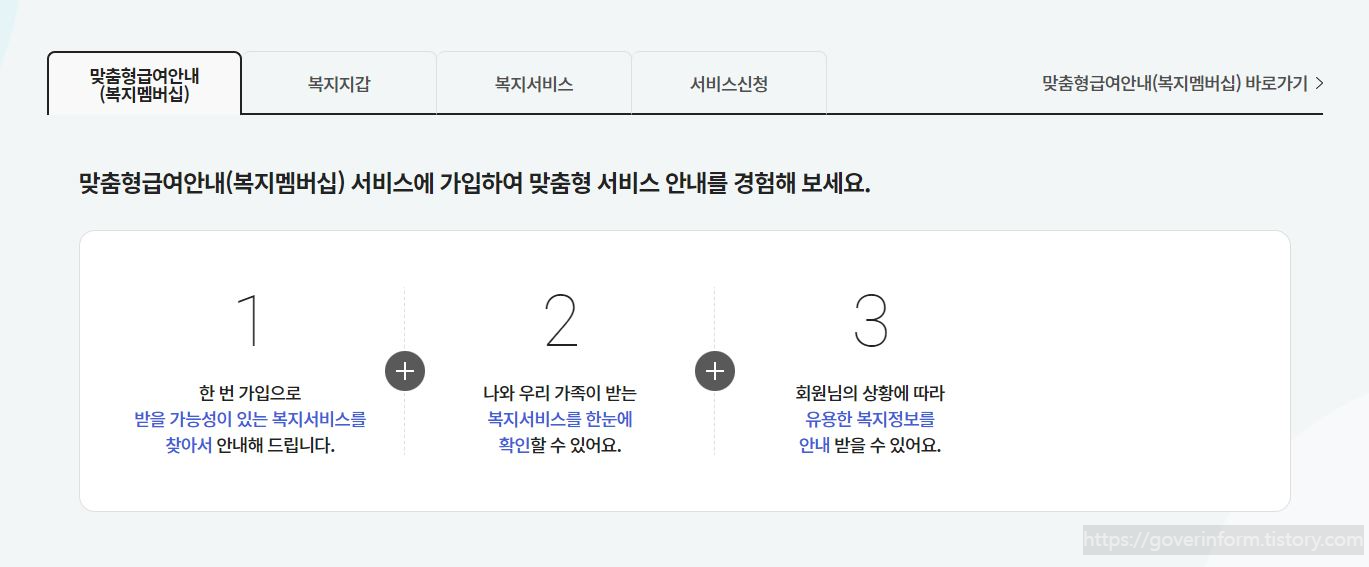 복지로 맞춤형급여안내(복지멤버십) 서비스에 맞춤형 서비스 안내를 경험해 보세요. 받을 가능성이 있는 복지서비스를 찾아서 안내해 드립니다. 나와 우리 가족이 받는 복지서비스를 한눈에 확인할 수 있어요. 회원님의 상황에 따라 유용한 복지정보를 안내 받을 수 있어요.
