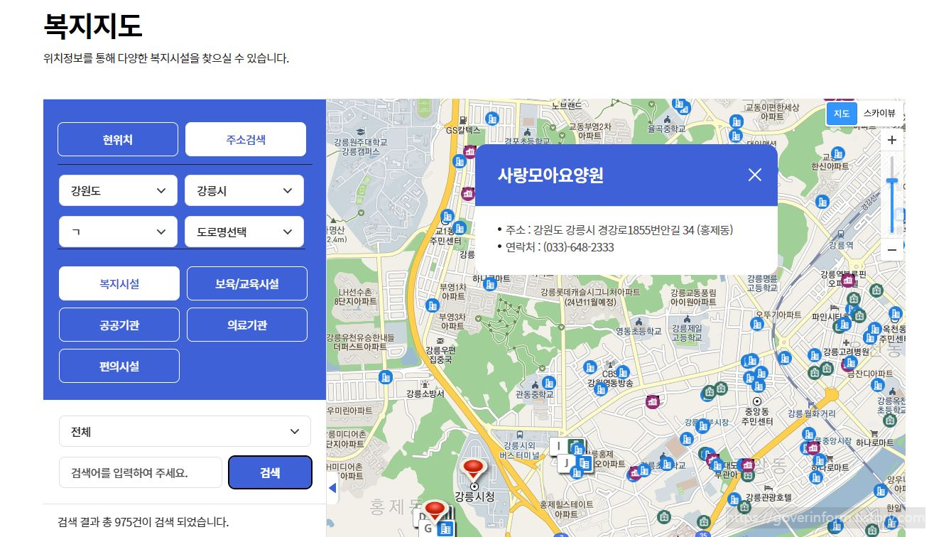 복지지도는 위치정보를 통해 다양한 복지시설(복지시설,보육/교육시설,공공기관,의료기관,편의기관)을 찾으실 수 있습니다. 복지지도 페이지에서 현위치 또는 주소검색(시/도, 시/군/구, 구분, 도로명)를 이용하여 검색을 하면 지도위에 정확한 위치 안내, 주소 및 연락처 안내를 합니다.