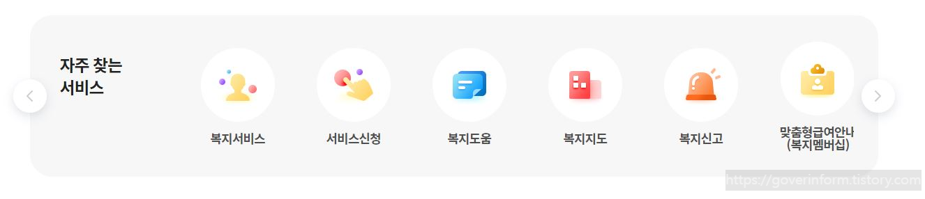 자주 찾는 서비스에는 복지서비스, 서비스신청, 복지도움, 복지지도, 복지신고, 맞춤형급여안내(복지멤버십)이 있습니다.
