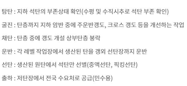 대한석탄공사는 1950년 창립 이래로 석탄 생산을 하고 있으며 강원도 태백, 도계, 화순 광업소에서 석탄광 개발 및 무연탄 생산 및 공급을 하고 있다. 전국 생산량에서 대한석탄공사 생산비중은 16년도 58%, 17년도 61%, 18년도 53%(계획) 수준이며 1,000m 이상 지하에서 삭탄을 생산하고 있다. 석탄 생산 공정도는 탐탄, 굴진, 채탄, 운반, 선탄, 출하로 구분할수 있다.