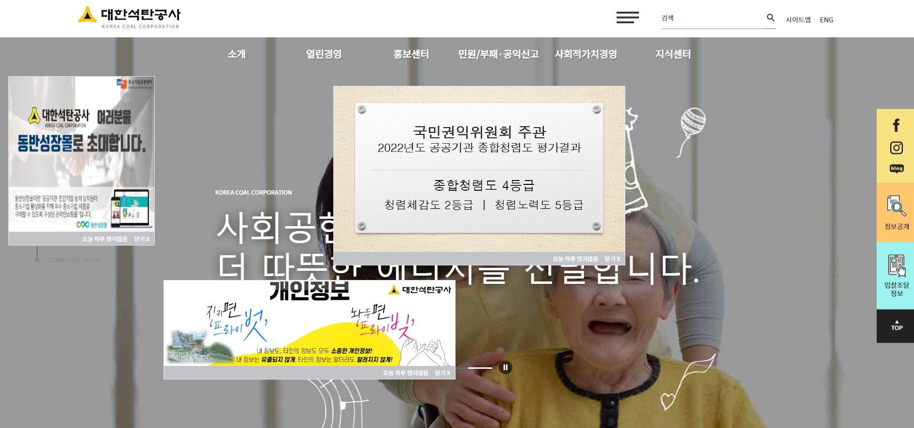 구글 검색창에 대한 석탄 공사 라고 입력하고 검색을 하면 대한석탄공사 홈페이지 url (www.kocoal.or.kr)이 나 온다. 여기에 접근하면 대한석탄공사 홈페이지 첫화면 즉 메인화면을 볼 수 있다. 대한석탄공사 홈페이지 바로가기