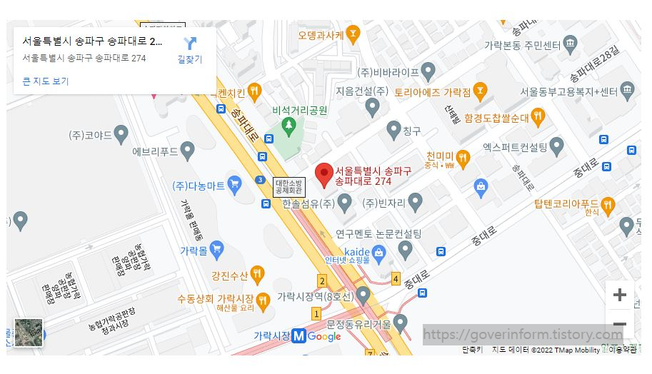 대한소방공제회는 서울 송파구 송파대로에 위치하고 있습니다. 가락시장역 8호선 4번출구와 가장 가깝습니다. 대한소방공제회 주소는 서울시 송파구 송파대로 274입니다. 아래 지도를 참고하면 찾아갈때 도움이 될것입니다.