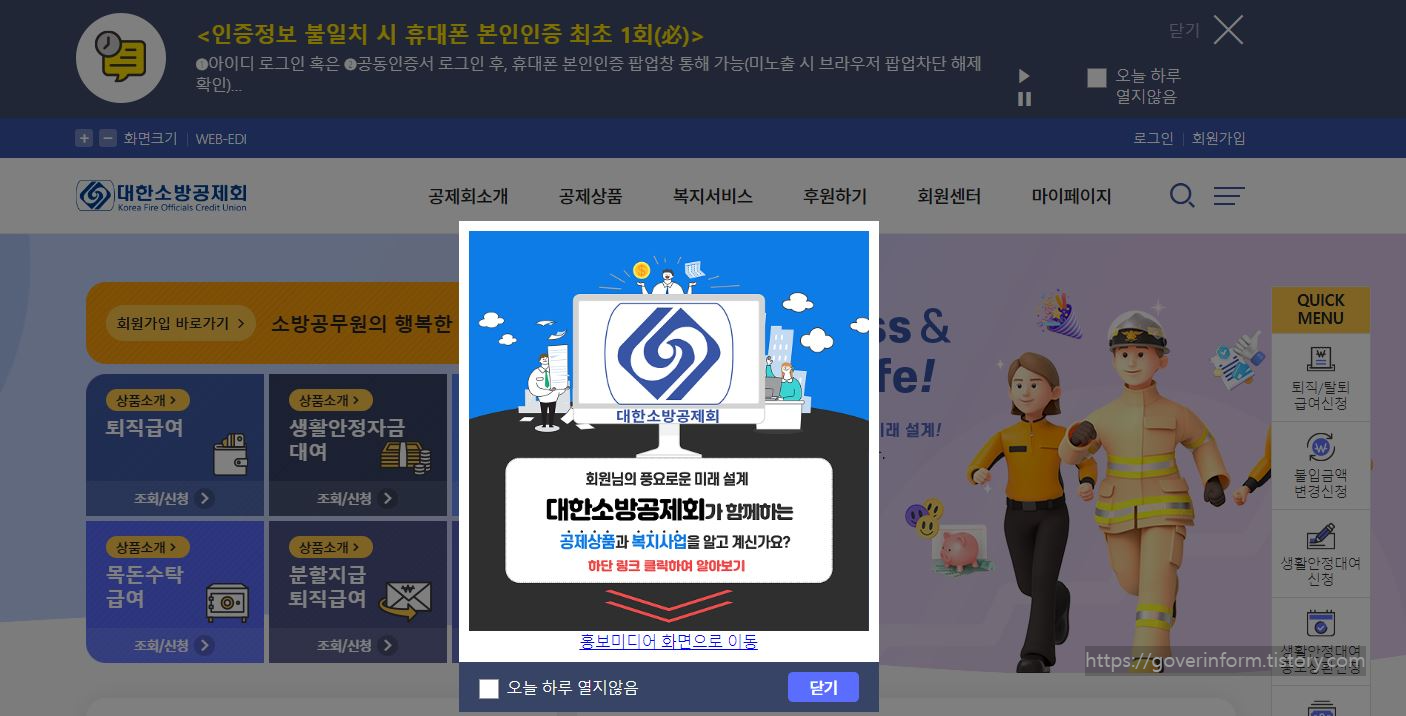 여기에서는 대한소방공제회 홈페이지 바로가기와 홈페이지에서 볼 수 있는 정보를 간단하게 정리하여 알려드리겠습니다. 쉽고 편리하게 이용할수 있으니 필요하신분들의 많은 이용바랍니다.