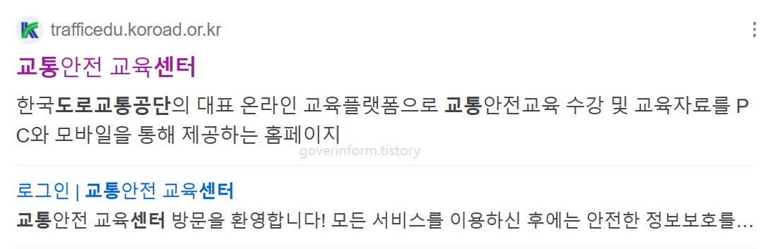 평소 이용하는 홈페이지 검색창에 '도로교통공단 이러닝센터'를 입력하고 검색합니다. 네이버에서 검색했을 때의 결과입니다.