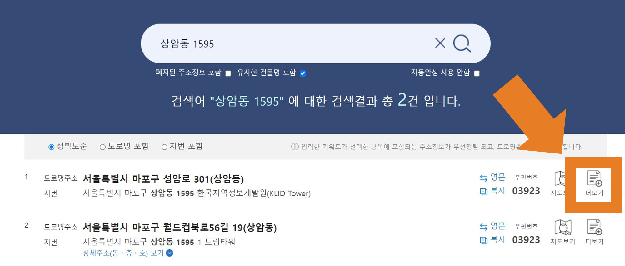3. 예를 들어 임의로 주소 하나를 검색해보겠습니다. 임의로 상암동 1595를 검색해보았습니다. 2건의 검색 결과가 나온다는 안내와 함께 주소와 인접한 건물의 두 가지 도로명 주소가 나옵니다.