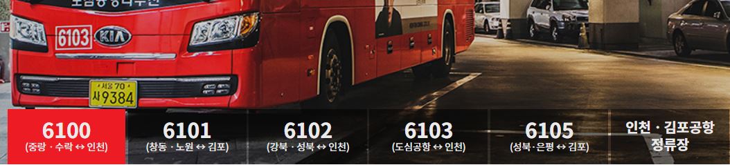 리무진 버스 운영 현황(5): 6100 (중랑·수락<->인천) 6101(창동·노원 <->김포) 6102(강북·성북 <->인천) 6103(도심공항 <->인천) 6105(성북·은평 <->김포)