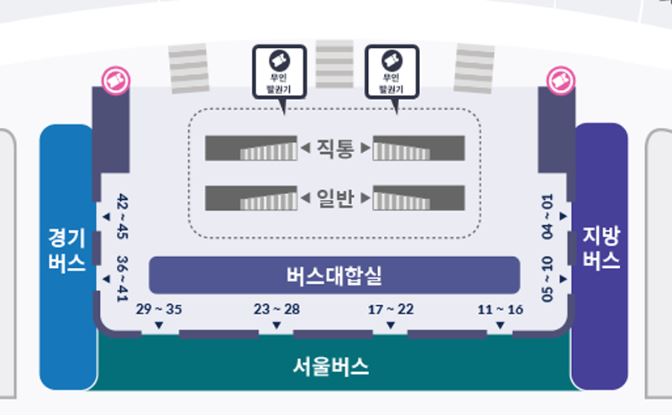 티켓 구입장소는 Gate 4번, 9번 옆 카운터이며 외부는 Gate 4,6,7,8,11,13번 출구 옆 버스 매표소입니다.