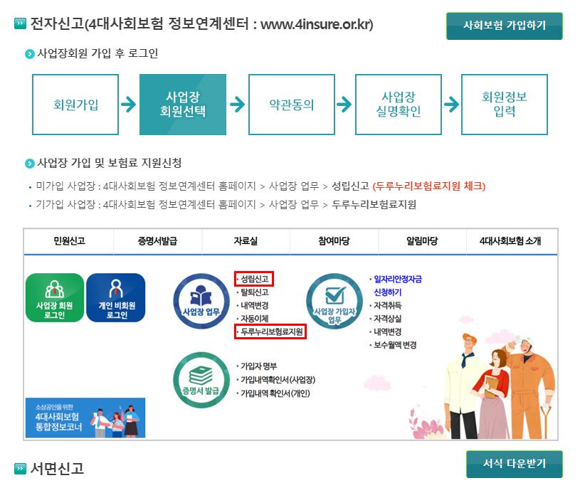두루누리 사회보험료 신청방법은 "4대사회보험 정보연계센터"에서 사업장회원 가입 후 로그인을 한 후에 신청하면 됩니다.