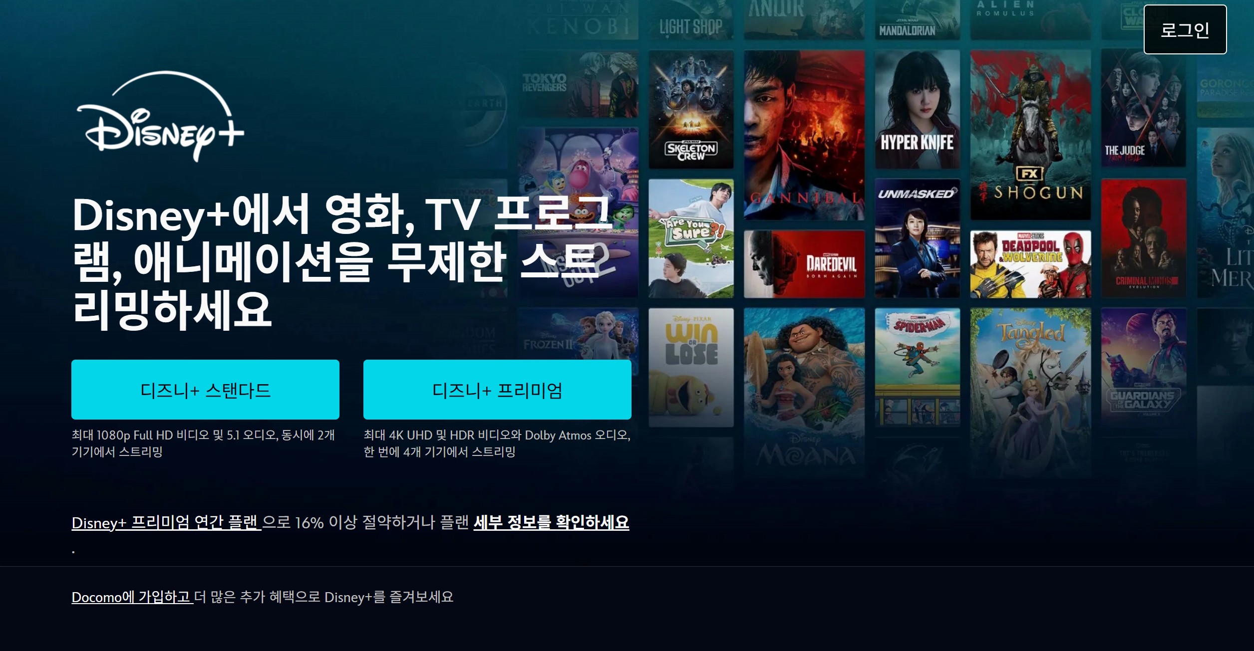 | 디즈니 플러스 스탠다드 | 광고 없는 스트리밍 최대 10대 기기에서 콘텐츠 저장 가능 지원되는 기기 2대 동시 스트리밍 세어플레이 지원 최대 5.1 풍부한 사운드 최대 1080p 풀 hd 생생한 화질 |